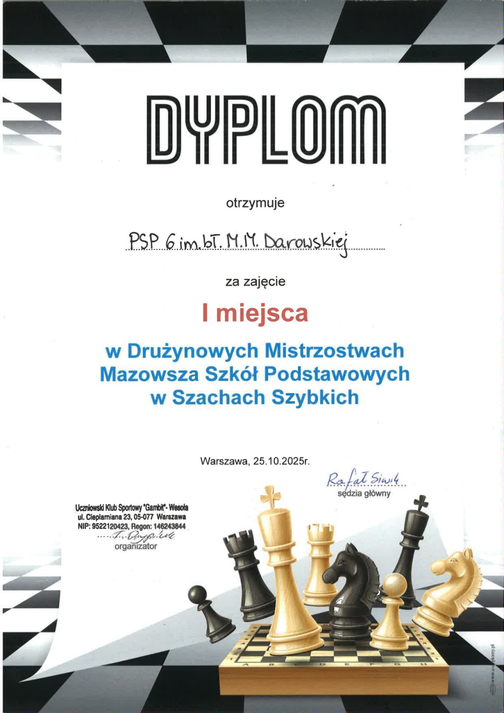 Dyplom - I miejsce w szachach szybkich