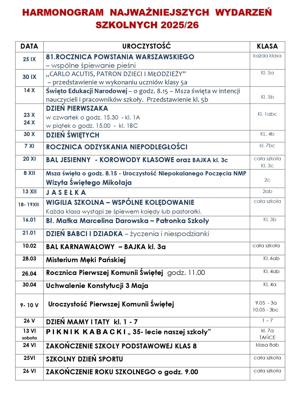 5. 5 czerwca (Wolny piątek po Uroczystości Bożego Ciała odpracujemy na Pikniku.)
